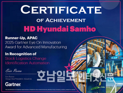 HD현대삼호는 최근 국제 컨설팅 전문기관 '가트너(Gartner)'가 주최한 '2025 Gartner EOI(Eye on Innovation) Awards' 첨단 제조 부문에서 아시아·태평양(APAC) 지역 준우승을 차지해 인증서를 받았다고 16일 밝혔다.