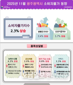 지난 10월 광주 소비자물가는 전년동월대비 2.3% 상승, 2024년 7월(2.8%) 이후 15개월 만에 가장 높았으나 지난달에는 보합세를 유지했다.