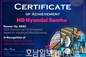 HD현대삼호의 스마트 조선소 구축 핵심 기술이 국제 경진대회에서 경쟁력을 다시 한번 입증했다. HD현대삼호는 최근 국제 컨설팅 전문기관 '가트너(Gartner)'가 주최한 '2025 Gartner EOI(Eye on Innovation) Awards' 첨단 제조 부문에서 아시아·태평양(APAC) 지역 준우승을 차지해 인증서를 받았다고 16일 밝혔다. 'EOI 어워즈'는 가트너가 매년 첨단제조를 비롯한 10개 산업 부문에서 전 세계 기업을 대상으로 기술 혁신을 이뤄낸 기업에 수여하는 상이다. 첨단제조 부문은 아메리카와 아시아·태평양, 유럽·중동·아프리카 등 3개 지역으로 구분해 진행된다. 각 지역별로 후보 10개 기업을 선정한 뒤 최종적으로 우승·준우승 기업에게만 인증서를 수여한다. HD현대삼호는 드론 촬영 영상 기반의 비전 인공지능(AI)을 활용해 선박 조립용 블록의 적치 상태를 분석·관리하는 '드론 활용 지능형 적치장 AI 분석 시스템' 과제를 발표해 준우승을 거머줬다. 국내 기업으로서는 최초의 수상 사례다. HD현대삼호를 비롯해 중국의 건축자재 제조기업인 중국건축자재그룹(CNBM)도 준우승을, 우승은 대만의 엣지 컴퓨팅 선도 기업인 에이디링크 테크놀로지(